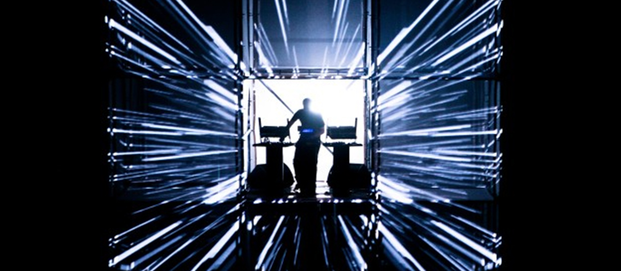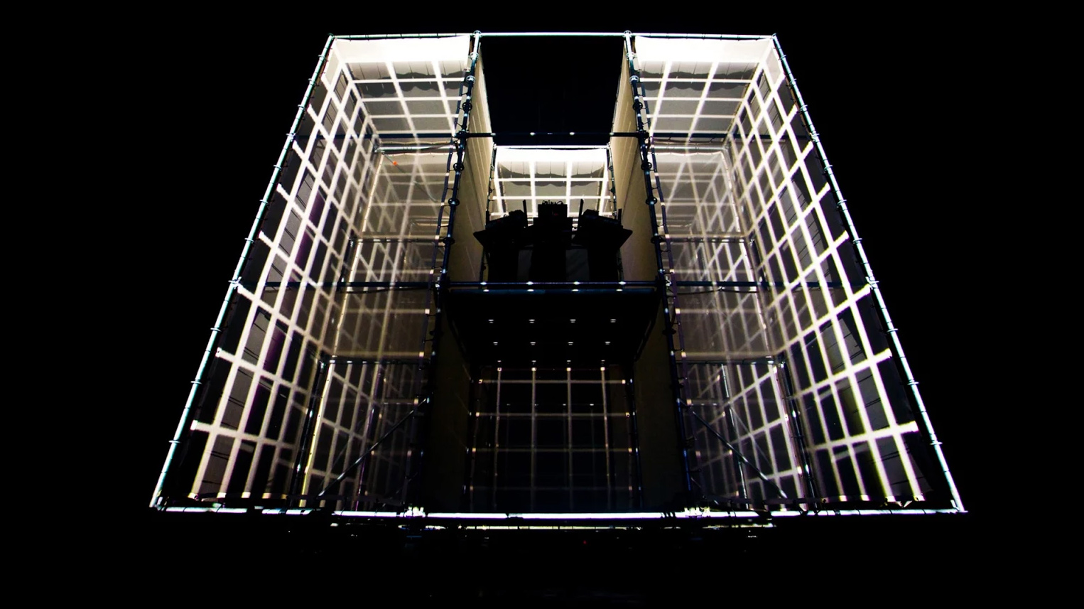 During the show, Etienne de Crécy stand in the middle of a 9 meters wide cube, subdivided in 9 sub-squares. Animated patterns are projected onto the volume, synchronized to the music beat, evolving during the show.