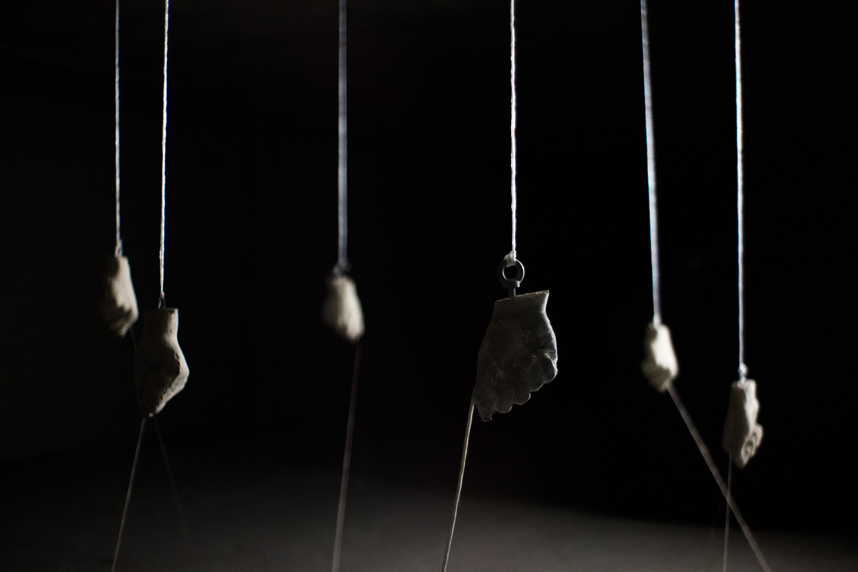 GPU Walk is an interactive installation staging a dozen of small robots, held on leashes by floating concrete hands. Those robots are made from old, salvaged graphic cards. They move around, bleep-blooping and making light from time to time. Infrared sensors make them react to human presence, fleeing away and reacting to how people walk around them.