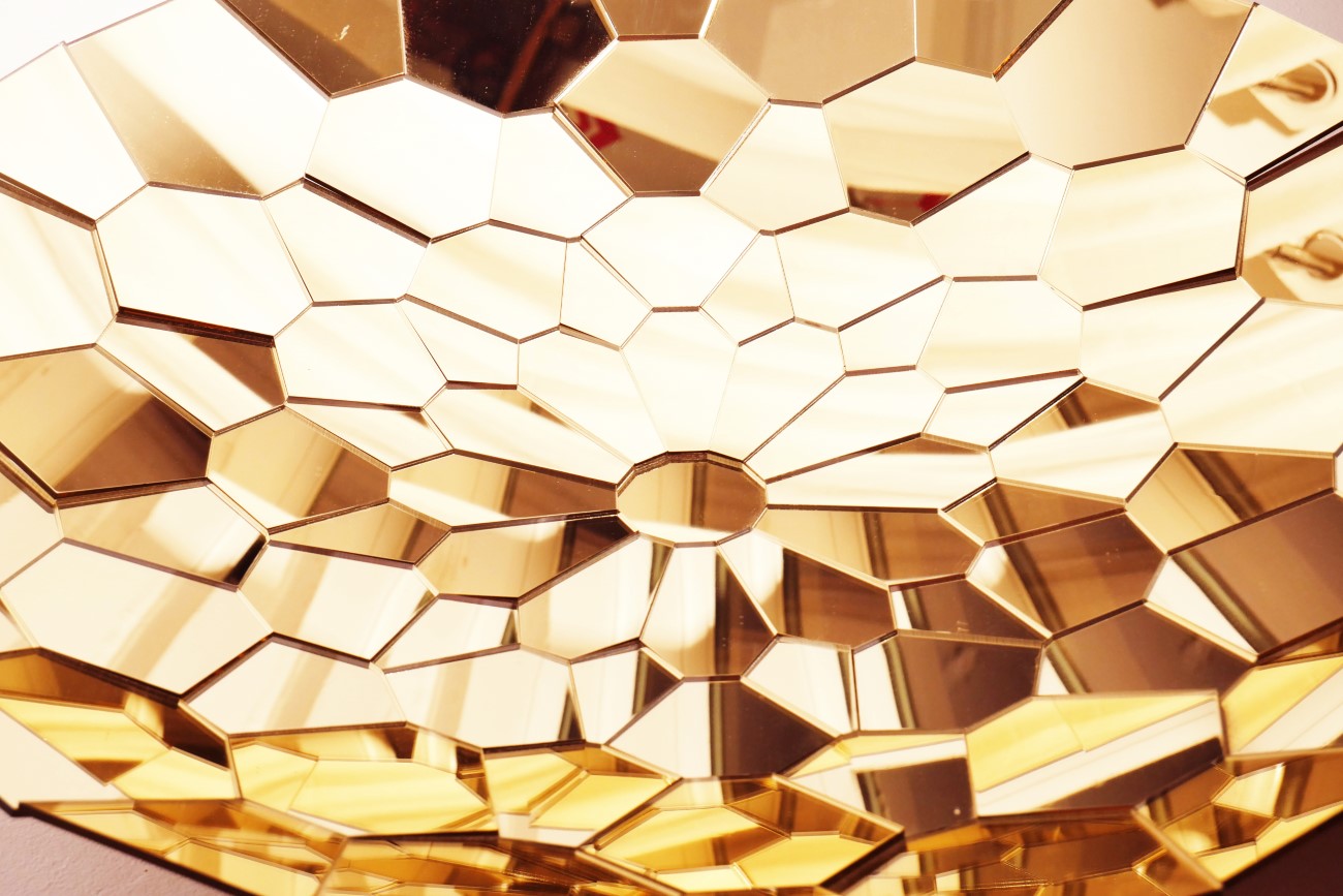 Mesmerize is a sculpture playing with one's self-awareness, blurring and splitting your own image, using optical illusion inspired patterns made out an alternance of black acrylic and acrylic mirrors :