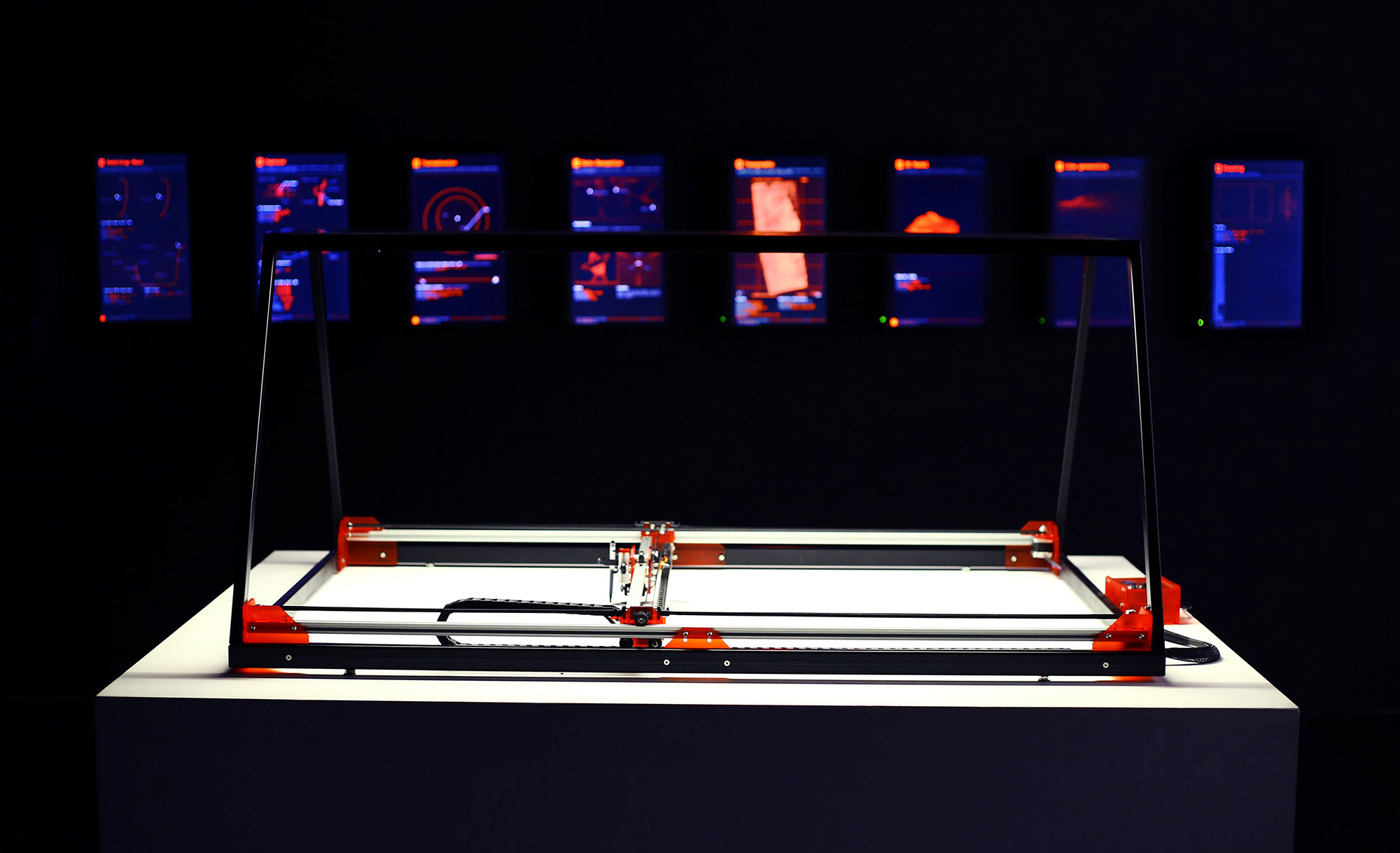 The video screens next to the machine reveal each steps leading to the current drawing, synced in real time with every pen movement. As the drawings evolves along hours and every day, video content is constantly changing. Each of the 8 steps previously detailed, from planet Mars surface up to the drawing on paper (a process that actually spread over months and millions of kilometers) are finally synced back, each one on a specific screen. One can read informations about speed, position, duration and scale, allowing a perception of the huge scales at play, and the vertiginous character of the whole process, that we see being accomplished before our very eyes.