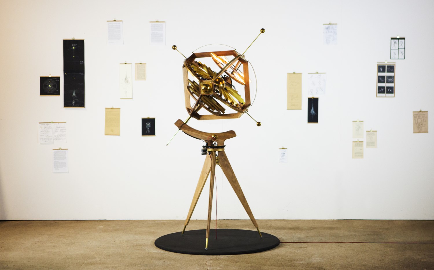 Inspired by celestial globes and science instruments from the 19th century like Foucault's gyroscope (which demonstrated the Earth's rotation), the Zettascope is built out of solid walnut, brass, acrylic glass, Geiger-Muller detection tubes, and various custom electronic equipment.